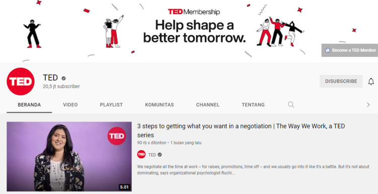 Yang terakhir adalah akun youtube TED, kamu mungkin sudah sangat familiar mengenal akun satu ini, mengingat banyak sekali video inspiratif dan menarik didalamnya. Jadi akun yang biasa dipanggil Ted Talk ini sangat wajib untuk kamu ikuti, mengingat salah satu kriteria untuk melanjutkan studi di luar negeri adalah memiliki critical thinking yang bagus, menonton konten dari Ted Talk yang sangat beragam dan mendatangkan pembicara hebat dari seluruh belahan dunia akan memperluas pengetahuan dan perspective kamu terhadap banyak hal.