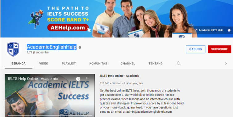 Channel selanjutnya yang harus kamu subscribe adalah channel youtube AcademicEnglishHelps, di channel ini kamu akan menemukan berbagai video belajar untuk meningkatkan kemampuan International English Language Testing System atau biasa disingkat IELTS. Seperti yang kamu ketahui, hampir seluruh Universitas di luar negeri meminta IELTS sebagai persyaratan utama ketika mendaftarkan diri. Di kanal youtube ini kamu bisa mempelajari IELTS secara mendalam, karena beragam video mulai dari pembahasan reading, writing, speaking, hingga listening. Bahkan AcademicEnglishHelps ini menampilkan secara jelas bagaimana tes IELTS berjalan, sehingga ketika kamu sering belajar menggunakan video AcademicEnglishHelps ini, kamu tidak akan kaget lagi ketika mengikuti tes IELTS resmi nantinya.