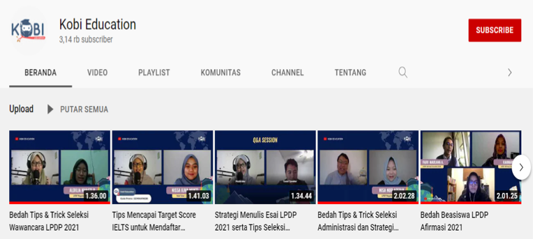 Kanal youtube selanjutnya adalah milik Kobi Education, di kanal youtube ini kamu akan menemukan banyak sekali dokumentasi seminar bedah beasiswa, tips dan trik belajar, serta sharing tentang studi di luar negeri. Semua dokumentasi tersebut bisa kamu tonton secara gratis. Kabar baiknya lagi, kanal youtube ini banyak sekali membahas bagaimana caranya untuk studi ke luar negeri dengan beasiswa. Kontennya pun seputar pembahasan bagaimana cara membuat esai, mempersiapkan persyaratan administrasi baik untuk universitas dan lembaga beasiswa, dan bedah beasiswa. Dengan menekan tombol subscribe di kanal youtube ini, kamu akan mendapatkan insight yang sangat luas mengenai studi di luar negeri nantinya.