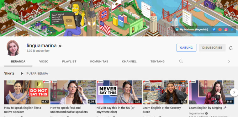 Kanal youtube pertama yang wajib kamu subscribe adalah kanal youtube “linguamarina” karena pondasi utama yang dibutuhkan untuk melanjutkan studi ke luar negeri adalah bahasa, belajar bahasa internasional merupakan kewajiban yang tidak bisa dihindari. Salah satu bahasa internasional yang wajib dipelajari adalah bahasa Inggris, bahkan walaupun negara tujuan studi tidak memakai bahasa Inggris sebagai bahasa utama, bahasa ini tetap harus dipelajari karena biasanya di dalam lingkungan kampus kebanyakan dosen dan mahasiswa menggunakan bahasa Inggris untuk berkomunikasi jika banyak mahasiswa internasional di dalam kampus tersebut.